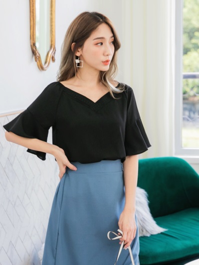 素面小雕花V領荷葉袖雪紡上衣