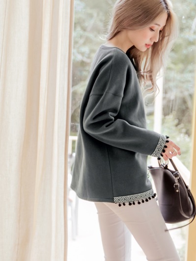 內刷毛拼接民俗流蘇下襬上衣