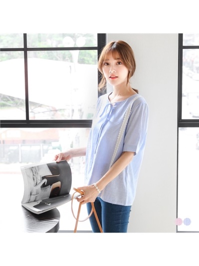 領口鏤空綁帶直條紋綴花邊蕾絲高含棉上衣 .2色