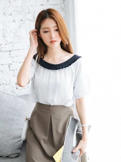排釦造型彈性荷葉邊拼接設計一字領雪紡上衣.2色