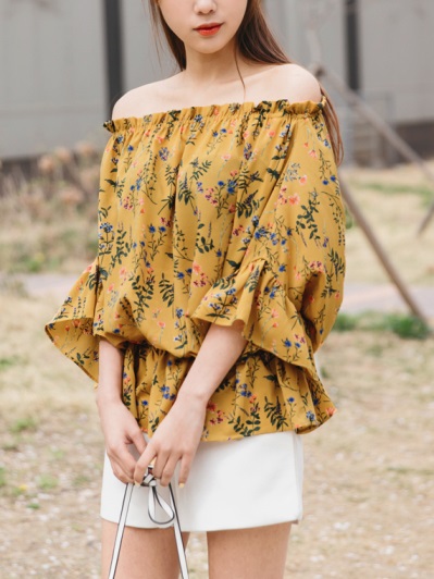 滿版印花下襬荷葉鬆緊圓領/一字領上衣