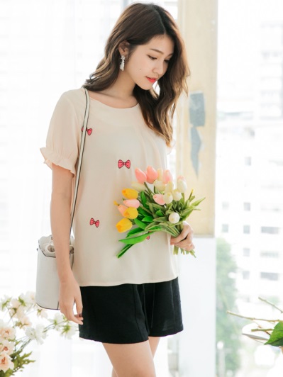 蝴蝶結刺繡袖口荷葉鬆緊雪紡上衣