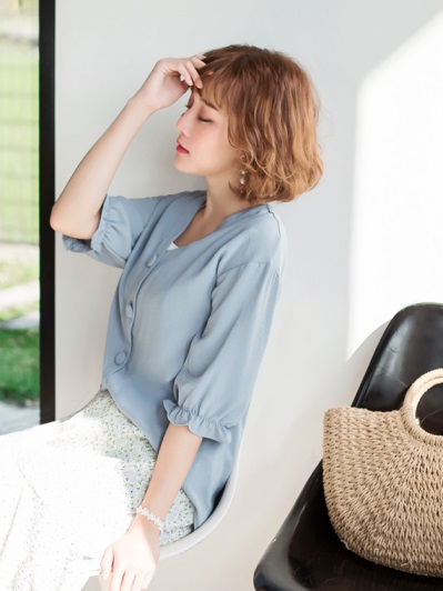 V領大圓釦不易皺涼感雪紡上衣
