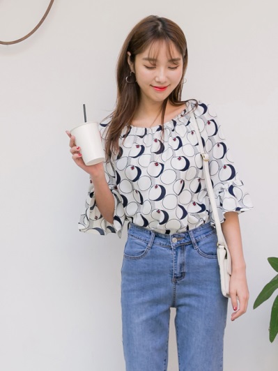 兩穿式滿版花樣一字圓領拉肩荷葉袖雪紡上衣