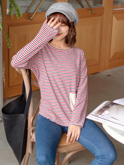 台灣製造.貓咪印圖口袋條紋磨毛上衣