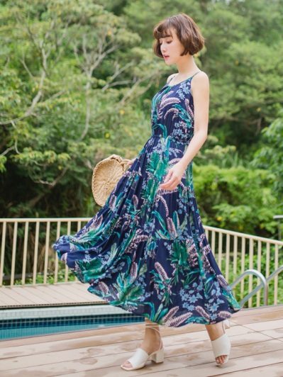 南洋度假花朵印流蘇綁帶細肩洋裝