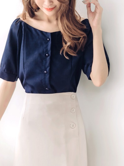 純色排釦設計圓領/一字領上衣