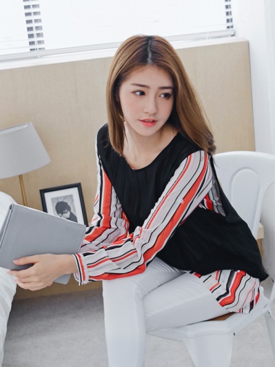 直條紋雪紡拼接微透縮背心假兩件式縮腰長版上衣.2色