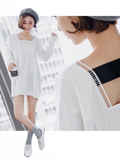 蜜桃絨鏤空條後挖背平口長袖寬鬆洋裝/長上衣.2色