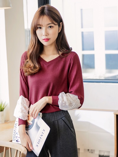 蕾絲雕花袖拼接純色針織v領上衣