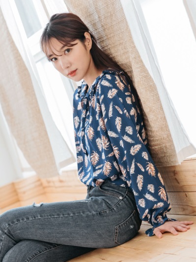 荷葉領綁帶羽毛印花上衣