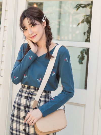 女孩感花朵刺繡高棉V領上衣