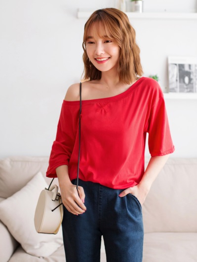 台灣製造.素面落斜肩寬領開衩T恤上衣