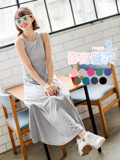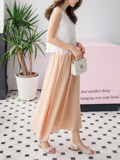 蕾絲x雪紡拼接無袖背心長洋裝.4色