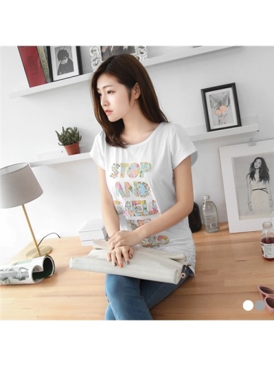 碎花字母珠珠綴造型側抓皺圓領休閒長上衣.2色