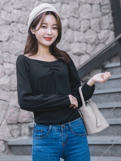 方領排釦肩抓皺設計純色針織上衣