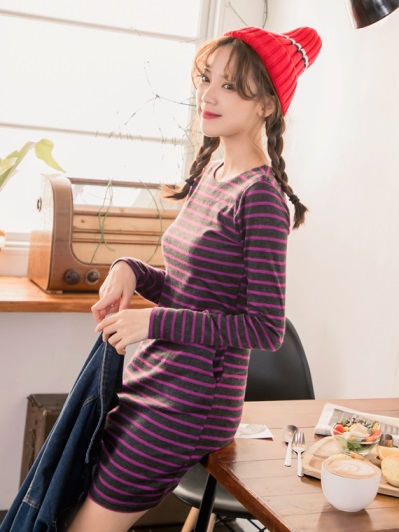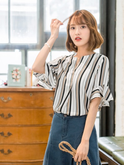 撞色直條紋珍珠釦V領荷葉袖雪紡上衣