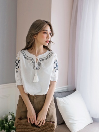 高含棉印花刺繡流蘇抽繩縮口袖上衣