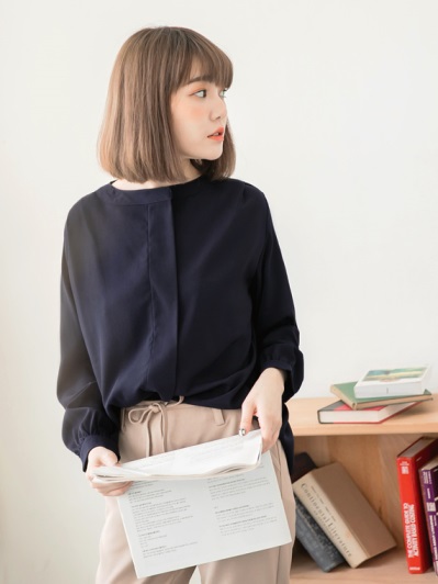 質感壓褶半開襟緞面雪紡上衣