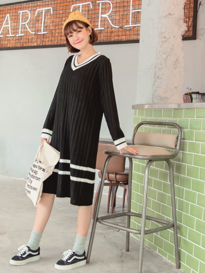 撞色V領長版針織上衣/洋裝