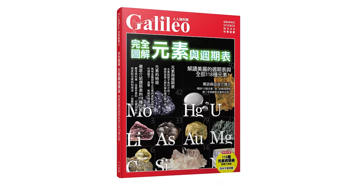 1.徹底介紹118種元素特質與其應用領域。 2.用生動豐富的模擬圖像,解構說明元素相關知識,簡單易懂。 3.適合正在學習化學知識的國、高中生,讓化學變得更加容易親近。 完全圖解 元素與週期表:解讀美麗的週期表與全部118種元素!人人伽利略03 商品網址: https://www.books.com.tw/exep/assp.php/87926/products/0010834095?utm_source=87926&utm_medium=ap-books&utm_content=recommend&utm_campaign=ap-202002