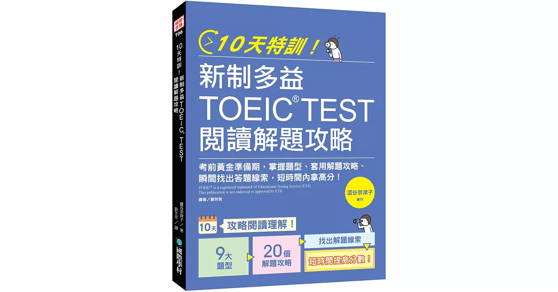 博客來-10天特訓!新制多益TOEIC TEST閱讀解題攻略:把握考前黃金準備期,掌握題型、套用解題攻略、瞬間找出答題線索,短時間內拿高分!訂購網址: https://www.books.com.tw/exep/assp.php/87926/products/0010820904?utm_source=87926&utm_medium=ap-books&utm_content=recommend&utm_campaign=ap-201906