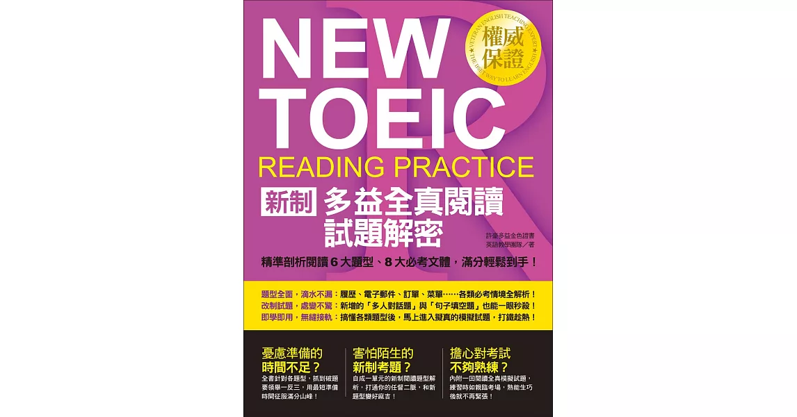 →→→→更多詳細”NEW TOEIC新制多益全真閱讀試題解密:精準剖析閱讀6大題型、8大必考文體,滿分輕鬆到手!”介紹請點我