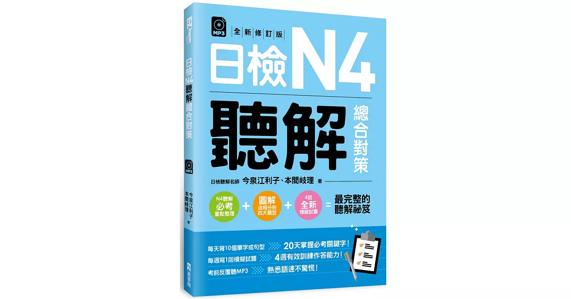 博客來-日檢N4聽解總合對策〈全新修訂版〉 〈附:3回全新模擬試題+1回實戰模擬試題別冊+1MP3〉訂購網址: https://www.books.com.tw/exep/assp.php/87926/products/0010790133?utm_source=87926&utm_medium=ap-books&utm_content=recommend&utm_campaign=ap-201906