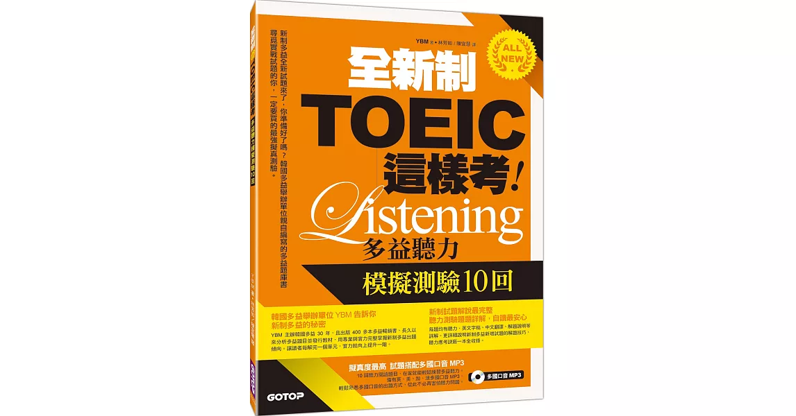 YBM用舉辦韓國多益多年的經驗,精選1000題共10回的聽力測驗,題題精選,並符合新制多益考試難度。因為最熟知新制多益的改變,才能掌握新制聽力的高分關鍵,