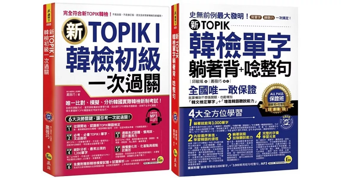 我識出版社了解考生們的需求,特邀請兩位「韓檢補教名師」邱敏瑤、叢薇巧老師,為你量身打造韓檢初級系列書,只要認真唸完這兩本書,並熟練老師在書中傳授的技巧,就有機會輕鬆考過韓檢初級!