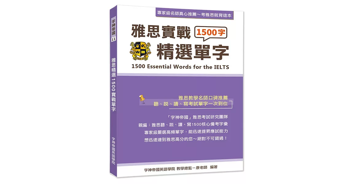 字神帝國雅思教學團隊,為台灣補教界長期鑽研雅思試題的教學單位,名師群由歷屆試題中嚴選出1500個核心高頻單字;讓讀者能有效理解雅思重要單字,取得高分成績。