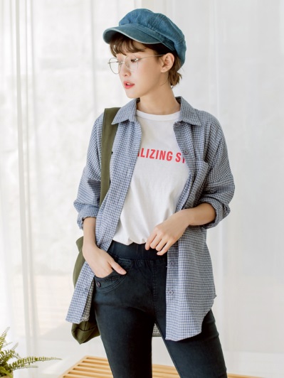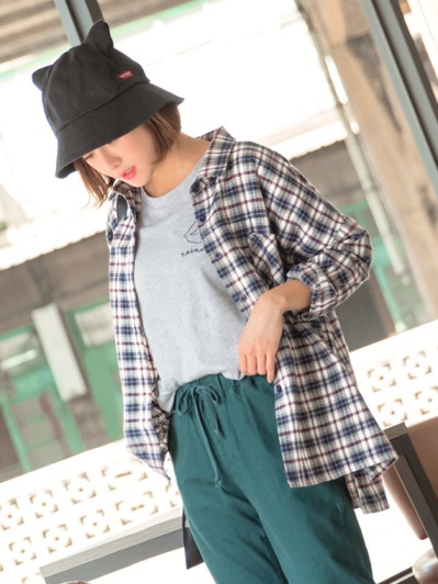 高含棉格紋排釦襯衫/罩衫