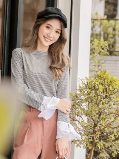 高含棉細橫條紋綁帶袖上衣