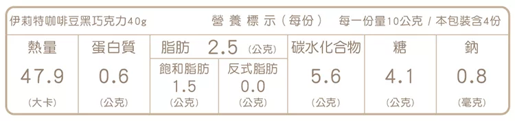 博客來-【Elit】伊莉特咖啡豆黑巧克力40g訂購網址: https://www.books.com.tw/exep/assp.php/87926/products/N001244659?utm_source=87926&utm_medium=ap-books&utm_content=recommend&utm_campaign=ap-202002