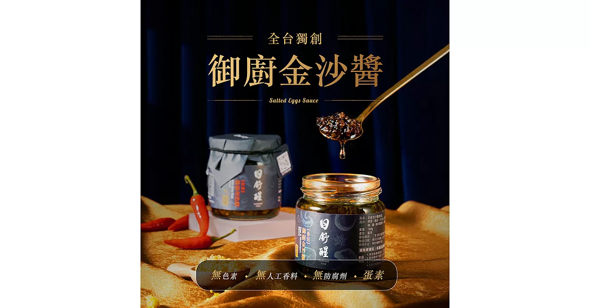 商品描述: 商品簡介:金沙醬有別於市面上任何一款醬料,有著充滿嚼勁的口感,彷彿在嘴中挑逗你的每一根味蕾,每一口都吃的到香氣十足的炒鴨蛋酥,吃完後的香氣餘韻還會留在嘴中讓人陷入無止盡的意猶未盡,是一罐讓你無時無刻都想來上一匙的萬用醬。(無色素、無防腐劑、無人工香料)讓人忍不住想在每道料理上加一匙的魔法「金沙醬」,一起來品味這神奇的滋味吧!聞:轉開蓋,鴨蛋的鮮味與香辛料的香氣撲鼻而來,自然食材的溫潤與天然調味的層……