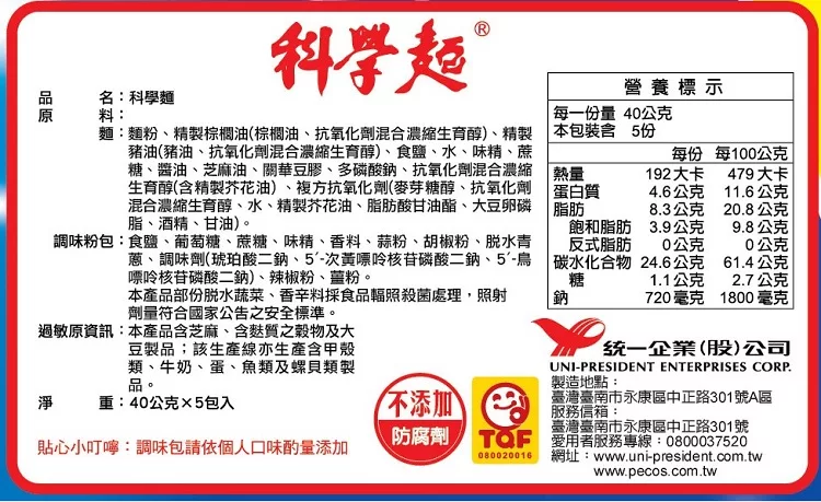 商品說明: 科學麵 – 原味五合一(40包/箱)